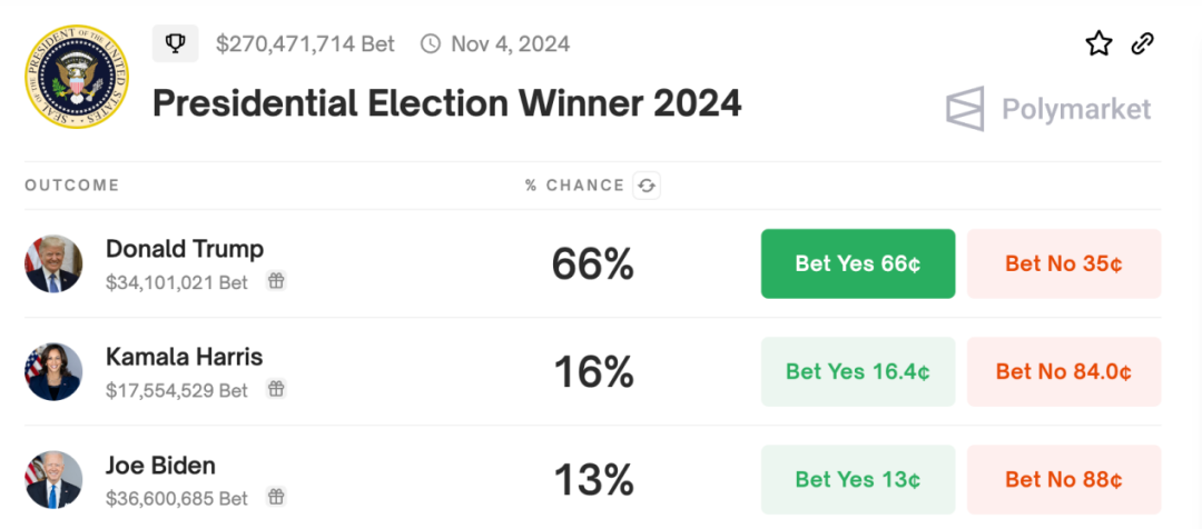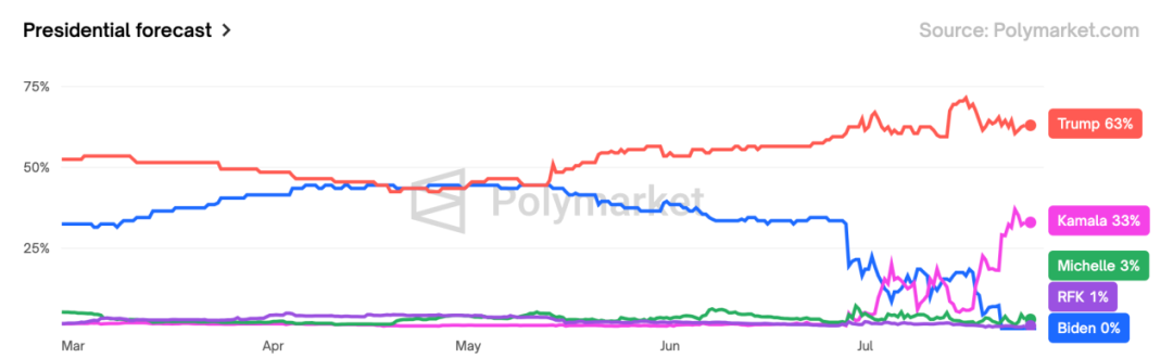 更有利念念的是,筆據(jù)咱們的跟蹤,早在7月18日,有博彩性質(zhì)的瞻望平臺Polymarket,就還是宣告哈里斯會接替拜登競選總統(tǒng),其時哈里斯的勝率為16%,比拜登向上3個點。