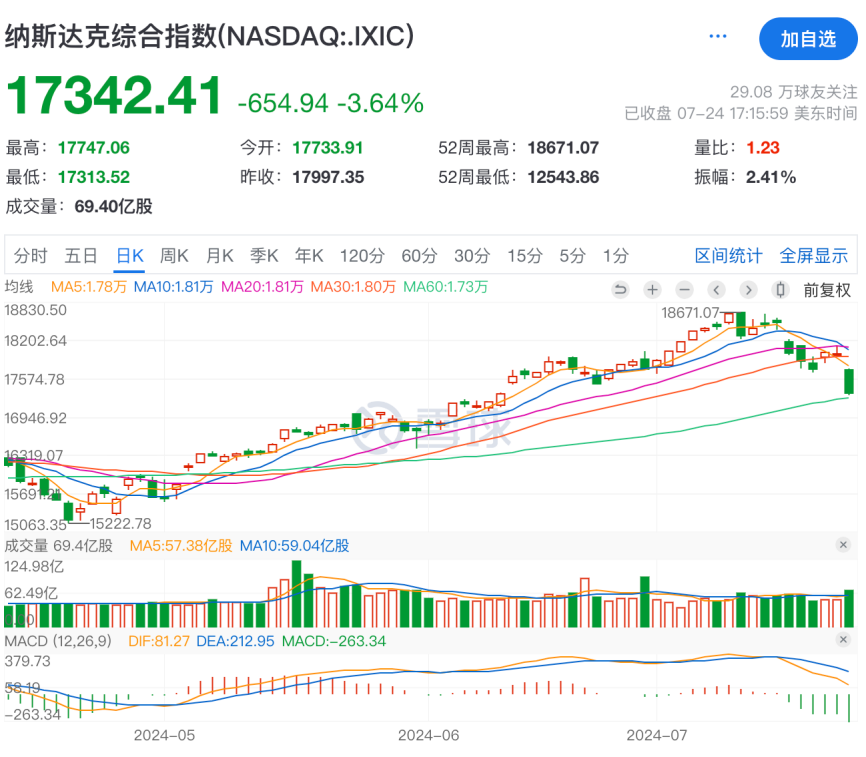 7月24日,納斯達克大跌3.64%,市值縮水近萬億好意思元,創(chuàng)2022年10月份以來的最大跌幅。