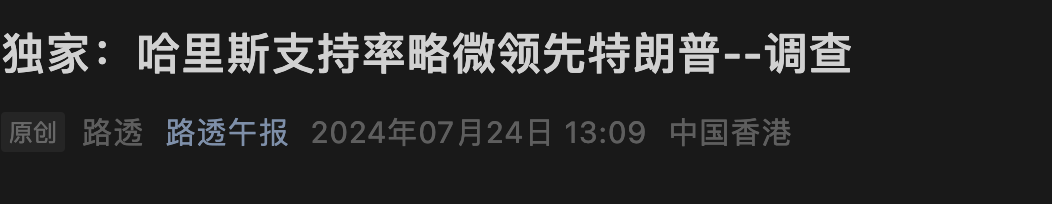 7月24日,路透中國在全球第一次報談,哈里斯的相沿率起始特朗普。