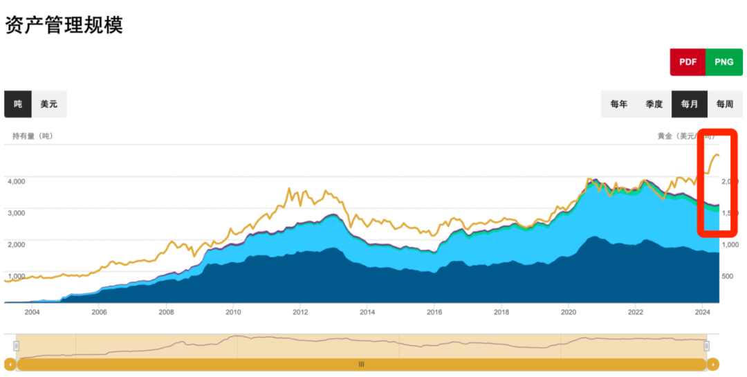 由于西洋投資者不停拋售,全球黃金ETF凈流出,金價和黃金ETF搞定邊界之間的裂口,達到幾十年最大。